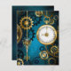Turquoise, textured, steampunk background with brass and gold gears, a silver key and the clock. Steampunk style.