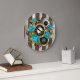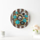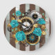 Patterned, antique watch, adorned with jewellery, gold hour hands and Latin numerals with turquoise roses on brown, striped background. Steampunk style.