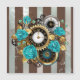 Patterned, antique watch, adorned with jewellery, gold hour hands and Latin numerals with turquoise roses on brown, striped background. Steampunk style.