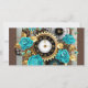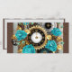 Patterned, antique watch, adorned with jewellery, gold hour hands and Latin numerals with turquoise roses on brown, striped background. Steampunk style.