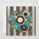Patterned, antique watch, adorned with jewellery, gold hour hands and Latin numerals with turquoise roses on brown, striped background. Steampunk style.