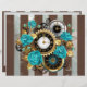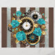 Patterned, antique watch, adorned with jewellery, gold hour hands and Latin numerals with turquoise roses on brown, striped background. Steampunk style.