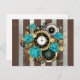 Steampunk Clock and Turquoise Roses on Striped Holiday Postcard