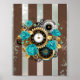 Steampunk Clock and Turquoise Roses on Striped Poster