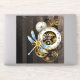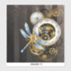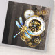Antique dials with gold and brass gears, decorated with mechanical dragonfly on brown, striped background. Steampunk.