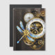 Antique dials with gold and brass gears, decorated with mechanical dragonfly on brown, striped background. Steampunk.