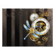 Antique dials with gold and brass gears, decorated with mechanical dragonfly on brown, striped background. Steampunk.