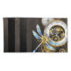 Antique dials with gold and brass gears, decorated with mechanical dragonfly on brown, striped background. Steampunk.