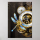 Antique dials with gold and brass gears, decorated with mechanical dragonfly on brown, striped background. Steampunk.