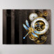 Antique dials with gold and brass gears, decorated with mechanical dragonfly on brown, striped background. Steampunk.