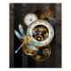 Antique dials with gold and brass gears, decorated with mechanical dragonfly on brown, striped background. Steampunk.