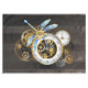 Antique dials with gold and brass gears, decorated with mechanical dragonfly on brown, striped background. Steampunk.