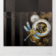 Antique dials with gold and brass gears, decorated with mechanical dragonfly on brown, striped background. Steampunk.