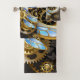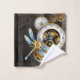 Antique dials with gold and brass gears, decorated with mechanical dragonfly on brown, striped background. Steampunk.