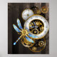 Antique dials with gold and brass gears, decorated with mechanical dragonfly on brown, striped background. Steampunk.