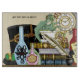Green small dragon sitting in a teacup that is on a pile of books. Top hat, potions, elixirs, feather pen, ink well, and clock with gears showing.