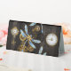 Antique dials and keys with gold and brass gears, decorated with mechanical, steampunk dragonflies on brown, striped background.