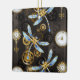 Antique dials and keys with gold and brass gears, decorated with mechanical, steampunk dragonflies on brown, striped background.