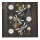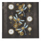 Antique dials and keys with gold and brass gears, decorated with mechanical, steampunk dragonflies on brown, striped background.