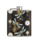 Antique dials and keys with gold and brass gears, decorated with mechanical, steampunk dragonflies on brown, striped background.