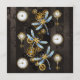 Antique dials and keys with gold and brass gears, decorated with mechanical, steampunk dragonflies on brown, striped background.