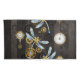 Antique dials and keys with gold and brass gears, decorated with mechanical, steampunk dragonflies on brown, striped background.
