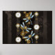 Antique dials and keys with gold and brass gears, decorated with mechanical, steampunk dragonflies on brown, striped background.