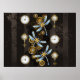 Antique dials and keys with gold and brass gears, decorated with mechanical, steampunk dragonflies on brown, striped background.