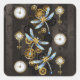 Antique dials and keys with gold and brass gears, decorated with mechanical, steampunk dragonflies on brown, striped background.