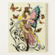 A blonde Steampunk fairy with pink and blue wings. The fairy is wearing cute outfit with a top hat, corset and striped stockings, Butterflies, clock, gears and tribal design all in a background of light yellow