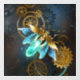 Steampunk firefly with blue transparent wings and green light bulb on worn, brown, textured background. Steampunk style.