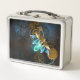 Steampunk firefly with blue transparent wings and green light bulb on worn, brown, textured background. Steampunk style.