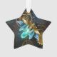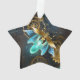 Steampunk firefly with blue transparent wings and green light bulb on worn, brown, textured background. Steampunk style.