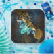 Steampunk firefly with blue transparent wings and green light bulb on worn, brown, textured background. Steampunk style.