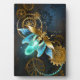 Steampunk firefly with blue transparent wings and green light bulb on worn, brown, textured background. Steampunk style.