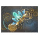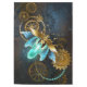 Steampunk firefly with blue transparent wings and green light bulb on worn, brown, textured background. Steampunk style.