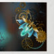 Steampunk firefly with blue transparent wings and green light bulb on worn, brown, textured background. Steampunk style.