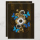 Composition of round steampunk clock with black Roman numeral dial, decorated with gold and brass gears, blue Morpho butterflies and damaged lenses on brown striped background. Steampunk style.