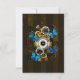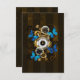 Composition of round steampunk clock with black Roman numeral dial, decorated with gold and brass gears, blue Morpho butterflies and damaged lenses on brown striped background. Steampunk style.