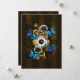Composition of round steampunk clock with black Roman numeral dial, decorated with gold and brass gears, blue Morpho butterflies and damaged lenses on brown striped background. Steampunk style.