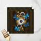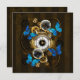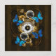 Composition of round steampunk clock with black Roman numeral dial, decorated with gold and brass gears, blue Morpho butterflies and damaged lenses on brown striped background. Steampunk style.