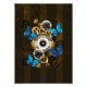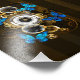Composition of round steampunk clock with black Roman numeral dial, decorated with gold and brass gears, blue Morpho butterflies and damaged lenses on brown striped background. Steampunk style.