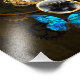 Composition of round steampunk clock with black Roman numeral dial, decorated with gold and brass gears, blue Morpho butterflies and damaged lenses on brown striped background. Steampunk style.