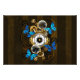 Composition of round steampunk clock with black Roman numeral dial, decorated with gold and brass gears, blue Morpho butterflies and damaged lenses on brown striped background. Steampunk style.