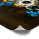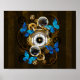 Composition of round steampunk clock with black Roman numeral dial, decorated with gold and brass gears, blue Morpho butterflies and damaged lenses on brown striped background. Steampunk style.