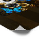 Composition of round steampunk clock with black Roman numeral dial, decorated with gold and brass gears, blue Morpho butterflies and damaged lenses on brown striped background. Steampunk style.