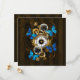 Composition of round steampunk clock with black Roman numeral dial, decorated with gold and brass gears, blue Morpho butterflies and damaged lenses on brown striped background. Steampunk style.