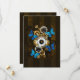 Composition of round steampunk clock with black Roman numeral dial, decorated with gold and brass gears, blue Morpho butterflies and damaged lenses on brown striped background. Steampunk style.