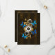 Composition of round steampunk clock with black Roman numeral dial, decorated with gold and brass gears, blue Morpho butterflies and damaged lenses on brown striped background. Steampunk style.