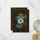 Composition of round steampunk clock with black Roman numeral dial, decorated with gold and brass gears, blue Morpho butterflies and damaged lenses on brown striped background. Steampunk style.